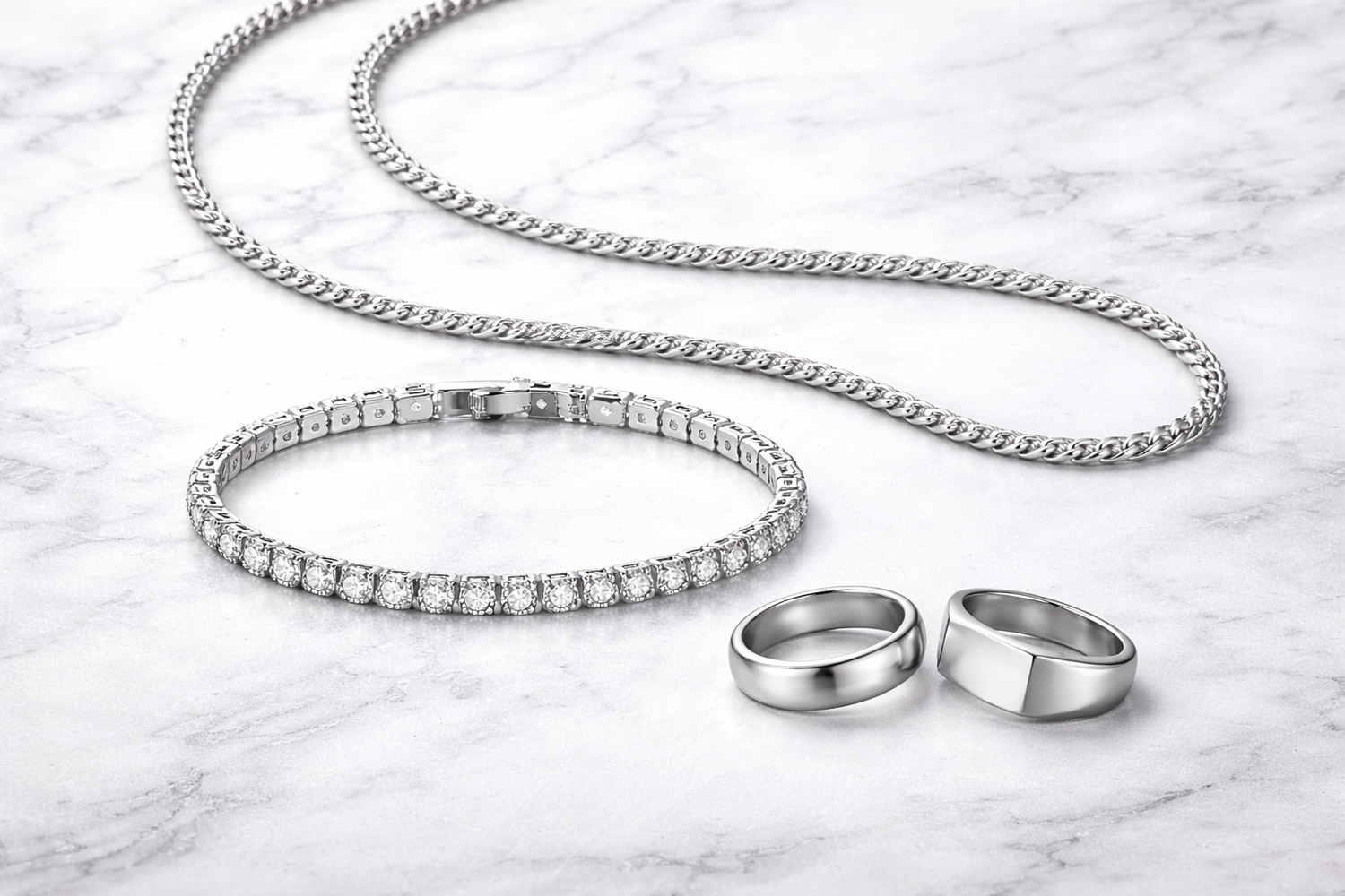 Includes a rope chain, tennis bracelet, and two essential rings.